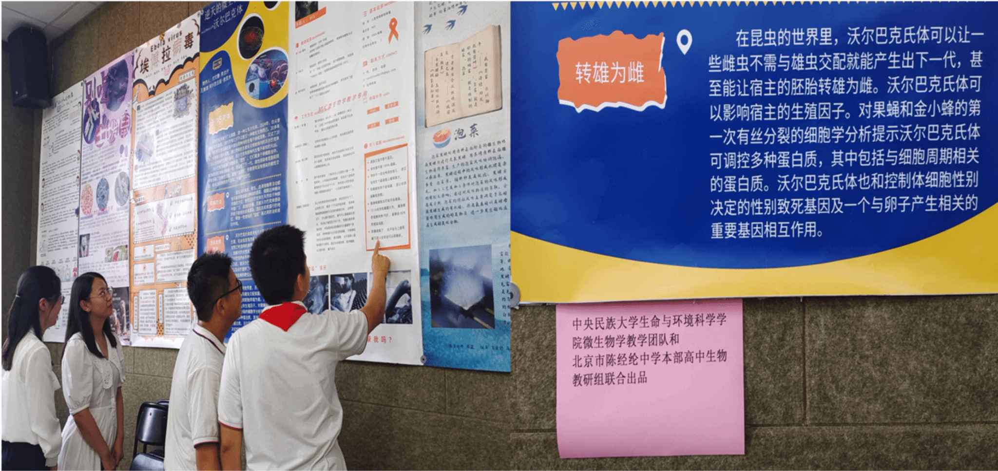 课程团队继续扩大推广范围,于今年开始与北京陈经纶中学进行合作。除常规校内海报展览外,2023年6月16日,在陈经纶中学教育集团崇实分校学苑校区召开的北京市生物学科“探究实践”活动现场会中,绅士网