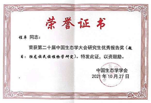 龙春林教授指导的博士研究生程卓有幸入选研究生论坛口头报告者之一,并以题为“独龙族民族植物学研究”的报告获得本次大会“研究生优秀报告奖”。