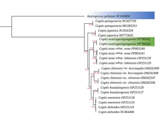 博士生程卓在龙春林教授指导下,前往高黎贡山地区开展云南黄连资源的调查,在德宏傣族景颇族自治州盈江县发现一种黄连属植物,与之前记录的形态不同。2024年4月龙春林教授课题组成员再次到发现地采集标本,通过开展形态特征比较和分类鉴定、DNA测序构建系统发育树等方面的研究,确认该物种为黄连属的新物种。基于其发现地点,即高黎贡山南延地区,该新种被命名为南高黎贡黄连(图2)。