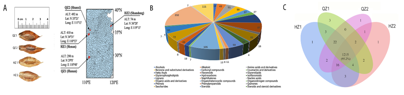 (A)杜仲翅果与其产地;(B)代谢物的分类;(C)四个样品中代谢物的维恩图。