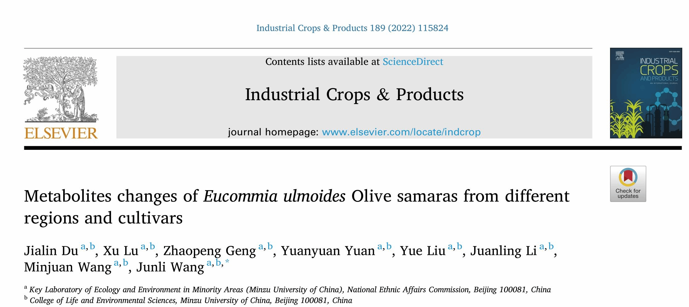 随着人们对杜仲认识的深入,对杜仲的利用由树皮、树叶、雄花逐渐扩展到翅果。产地和品种直接影响次生代谢物的种类、含量,这与药用植物内在的品质密切相关。但目前对不同产地和品种间杜仲翅果内源性代谢物差异的研究很少。王俊丽教授团队采用代谢组学方法,研究了不同产地和不同栽培品种对杜仲翅果内源代谢产物变化的影响。相关研究成果近期以“Metabolites changes ofEucommia ulmoidesOlive samaras from different regions and cultivars”为题发表在Industrial Crops and Products(农林科学类1区Top期刊,IF = 6.449)上。原文连接://doi.org/10.1016/j.indcrop.2022.115824。