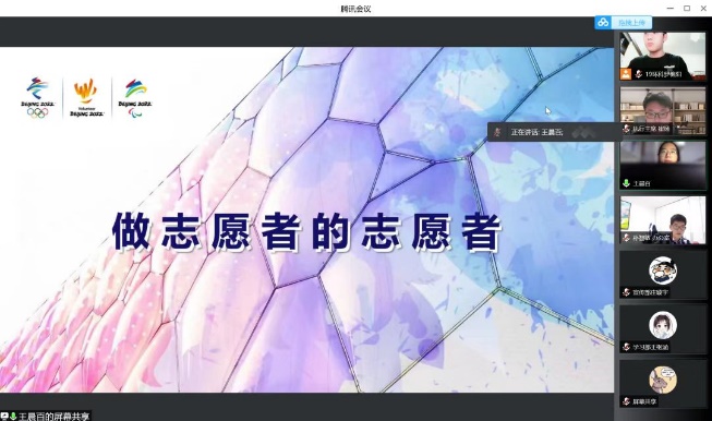 王晨百同学为大家分享了自己在冬奥会期间担任志愿者的经历及感受。首先,王晨百同学以一句“助人者自助,乐人者乐己”为引,讲述了自己参加冬奥志愿者的原因,她希望用自己的力量去守护冰雪荣光,守护团结,守护希望。随后,她为同学们介绍了北京冬奥颁奖广场和延庆残奥颁奖广场,让大家对冬奥的场馆建设有了更深入的了解。在冬奥会期间王晨百作为志愿者领域综合组组长,不仅要负责统计数据、组织召开例会,更要负责策划活动、对接交通、对接餐饮等工作,被大家亲切称为“志愿者的志愿者”,她向大家分享了自己在这个过程中收获的宝贵经验和珍贵友谊。作为这次冬奥会的亲身参与者她切身感受到了什么是与祖国同呼吸共命运,同时她也为祖国的强大深感骄傲与自豪。