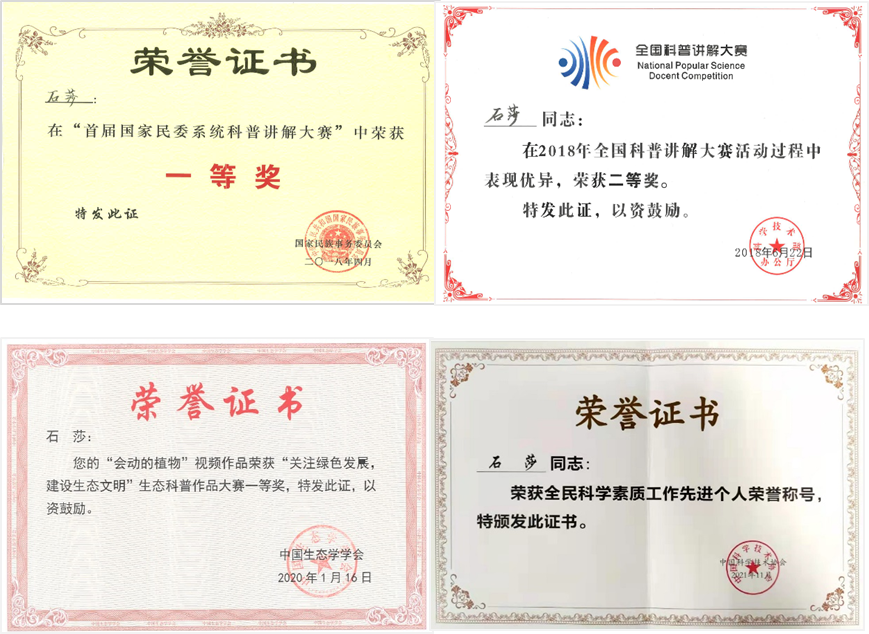 石莎教授在“首届国家民委系统科普讲解大赛”中荣获一等奖,代表国家民委先后获得全国科普讲解大赛二等奖(2018)、全民科学素质工作先进个人(中国科协技术协会,2021),制作的科普视频作品“会动的植物”获得中国生态学会举办的“关注绿色发展、建设生态文明”生态科普作品唯一一等奖(2020)。此外,多次获得国家民委系统科普讲解大赛优秀指导教师。