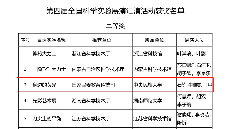 石莎教授带领团队成员丁甲(2019级生态学本科生)、牛雅雯(2019级生态学本科生)和杨丽雯(2020级生态学硕士生)展演的“身边的荧光”作品获得了全国总决赛二等奖。该团队是国家民委选送的三支代表队中唯一闯入全国总决赛的队伍,实现了我校在本项赛事的历史性突破,充分展现了国家民委、学校、学院一线科普工作者的特色与风采。
